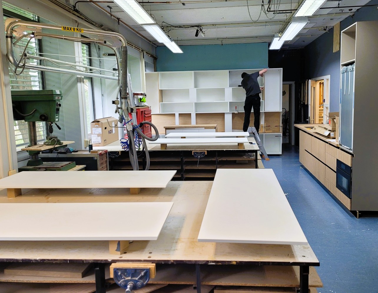 Een maatwerkinterieur of keuken van Doorrood wordt niet in een anonieme fabriek geproduceerd, maar groeit stap voor stap in onze eigen werkplaats in Haren – vlak onder Groningen, in onze grote werkplaats in de creatieve broedplaats De Biotoop. Hier bouwen we keukens. Het aansturen van onze moderne grote CNC machines combineren we met handwerk, alles met aandacht, met kennis van materialen en oog voor detail. Alles gebeurt lokaal. En juist dat maakt het verschil.